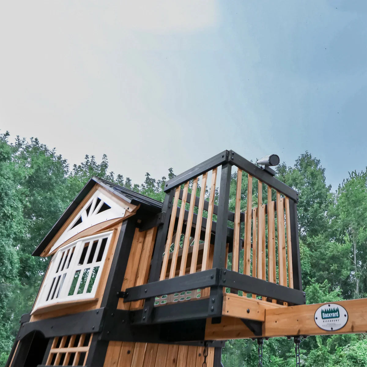 Adventurous play meets timeless style with the Magnolia Falls Swing Set, designed to transform your backyard into the perfect playground. This premium wooden swing set combines beautiful design with exciting play features that spark imagination and endless fun. The spacious elevated clubhouse features a peak roof, cute bay windows, and a connected crow's nest where little explorers can spot new adventures through the toy telescope. Kids can choose between the twisting spiral tube slide or the speedy wave slide for thrilling routes back to the ground. The daring rock wall offers an exciting climbing experience while the belt swings and fun web disc swing invite kids to soar. The lower playhouse inspires fun with its adorable play kitchen, featuring a toy stovetop, sink, and cookware set for preparing pretend meals. A working half-door adds realistic charm, while the mounted chalkboard invites artistic expression. Crafted from naturally durable cedar wood, this backyard playset ensures lasting quality throughout the years. Setting up your kids' swing set is hassle-free with a ready-to-assemble design and guided instructions through the BILT® app. Bring home the Magnolia Falls and watch as your backyard becomes a favorite destination where children develop active play skills, creativity, and friendships.