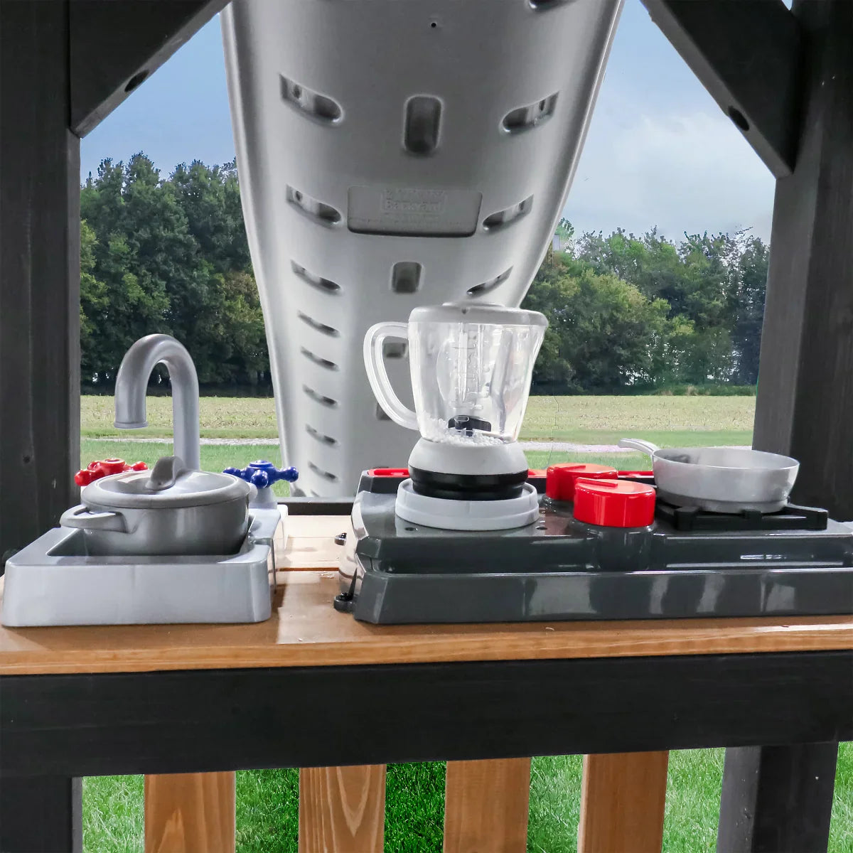 - Battery powered kitchen accessories (blender and stove top) with play sink and faucet inspire imaginative play