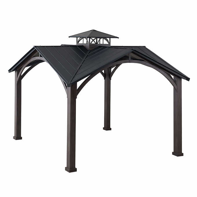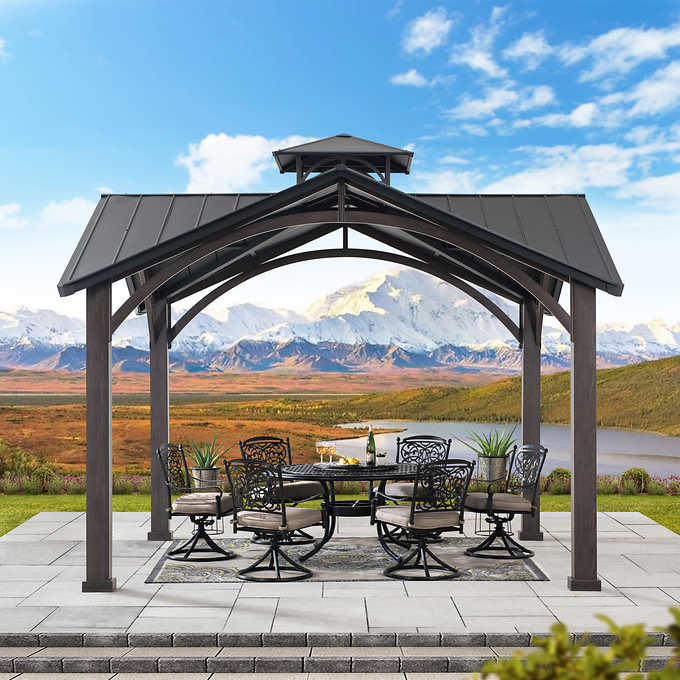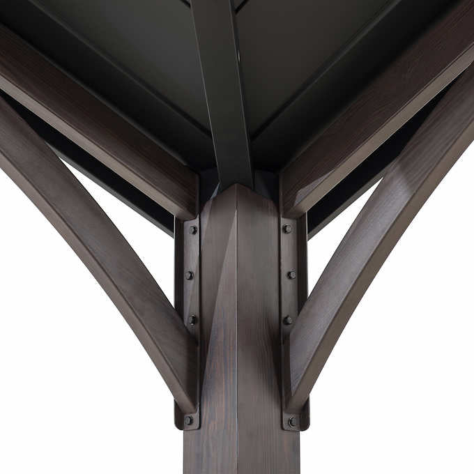 The timeless matte black weather-resistant powder-coated finish on the rust-proof aluminum roof will stand the test of time. The two-tier roof design provides just the right amount of airflow while keeping occasional inclement weather at bay. Enjoy the natural looking appearance of a rich dark brown wood frame constructed of rust-proof aluminum and rust-resistant galvanized steel. Set the mood by suspending a chandelier from the incorporated ceiling hook for functional light and high design. With straight-forward, easy-to-follow assembly instructions you will be relaxing with your beverage of choice in your favorite new outdoor living space for years to come.