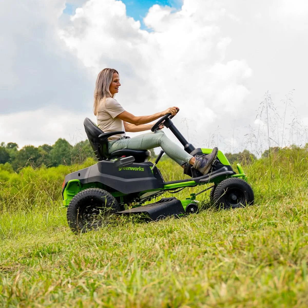Greenworks 80V 42" Ride-on Tractor Mower w/ (6) 8Ah Batteries, 1.5kW Charger, and Bagger