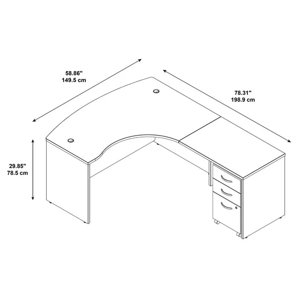 - Bundle Includes: 60"W x 43"D Right Hand L-Bow Desk Shell, 36"W Return Bridge, and 3 Drawer Mobile Pedestal