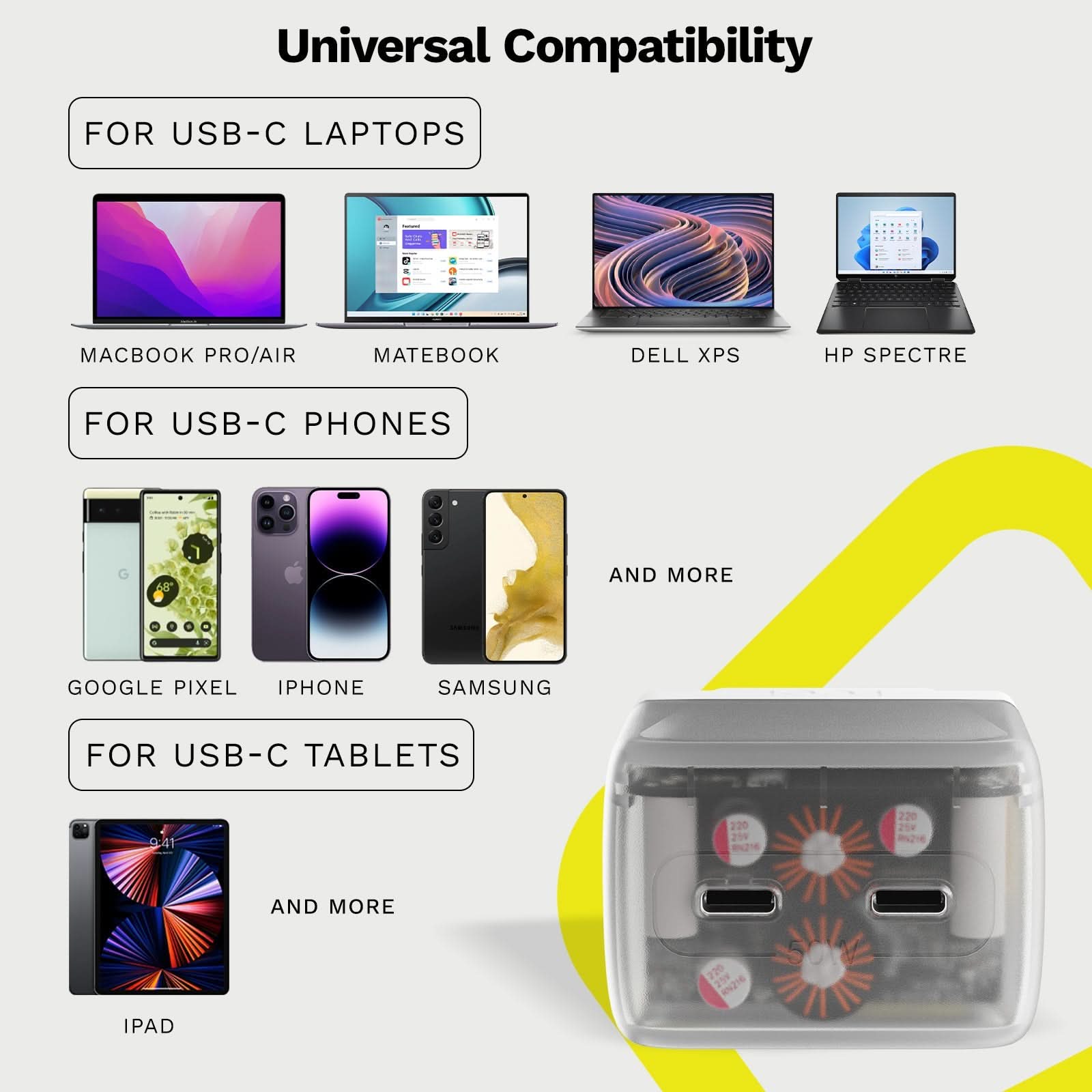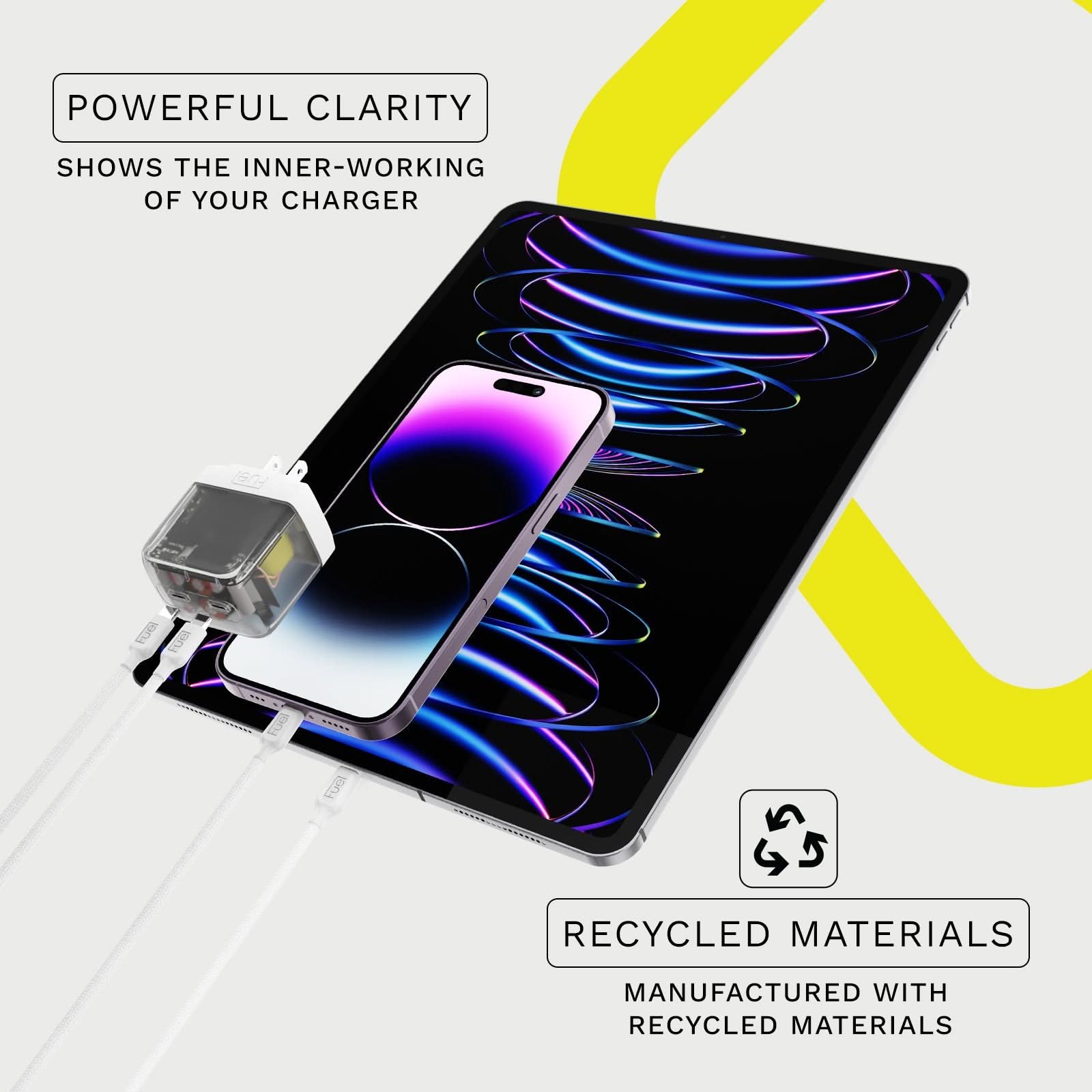 This semi-transparent 50W Foldable Wall Charger includes two USB-C fast charging ports so you can power multiple devices at once. Smart Charging Technology (SCT) allows the charger to customize speeds based on the device you are charging, giving you the maximum output allowed (up to 50W). This charger is compatible with Apple, Samsung and other smartphone brands and is perfect for the iPad Pro, iPad Air and any other USB-C compatible tablets. The 50W charger can also be used for the MacBook Pro 13 & 14