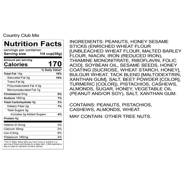 - 16 oz. Country Club Mix - Roasted and salted to perfection, this assortment of premium nuts (Peanuts, cashews, almonds & pistachios) is complimented with delicious honey sesame sticks and honey roasted peanuts. This sophisticated mix is sure to be a crowd pleaser.