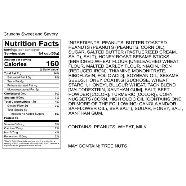 - 16 oz. Crunchy Sweet & Savory - This mix is sure to satisfy both your sweet and salty cravings. Included are savory honey roasted peanuts, butter toasted peanuts, roasted and salted peanuts complimented by honey sesame sticks and corn nuggets