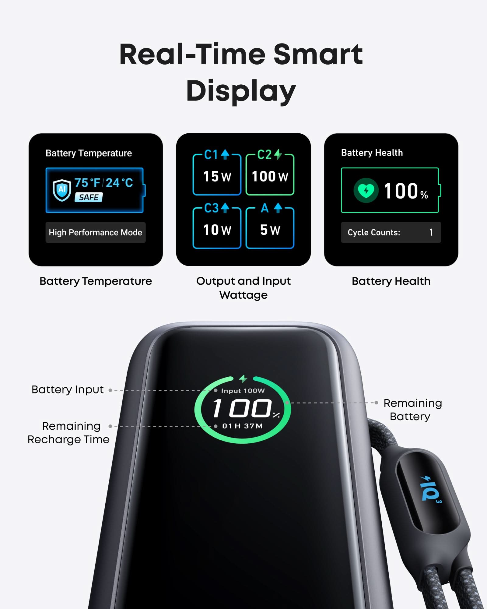 1. Data is based on internal lab testing. The power bank achieves its 100W peak recharging rate only when its battery level is above 25%.