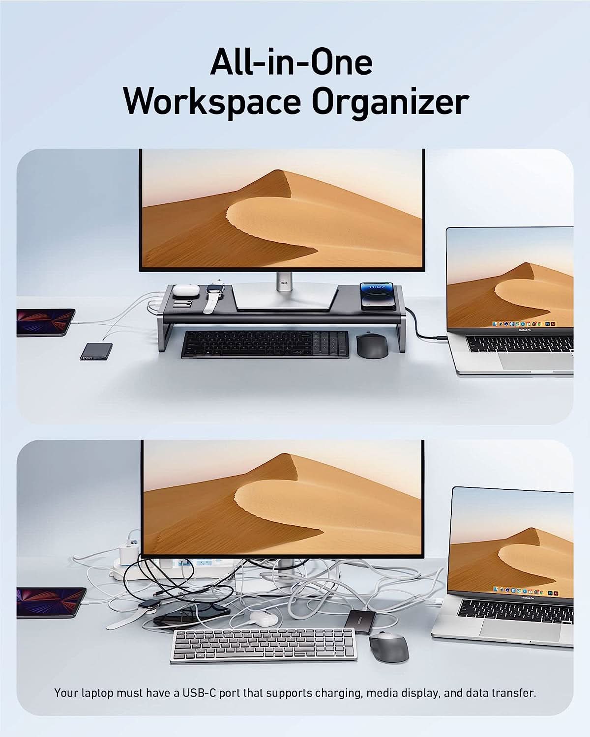 - 12-in-1 Docking Station and Monitor Stand: Equip your workstation with a 100W max USB-C upstream port (connect to laptop), 3 USB-A ports, 2 USB-C ports, SD/microSD card slots, a 4K HDMI port, a wireless charging pad, and an Ethernet port.