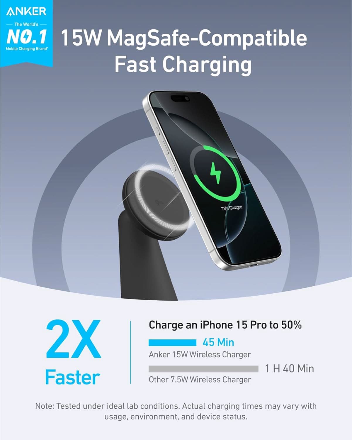 - 15W Qi2 Super Fast Charging: Maximize your time with this ultra-fast 15W Qi2 wireless charger, making low battery warnings a thing of the past. Power an iPhone 15 Pro from 0 to 30% in just 24 minutes. (Note: Tested under ideal lab conditions. Actual charging times may vary with usage, environment, and device status.