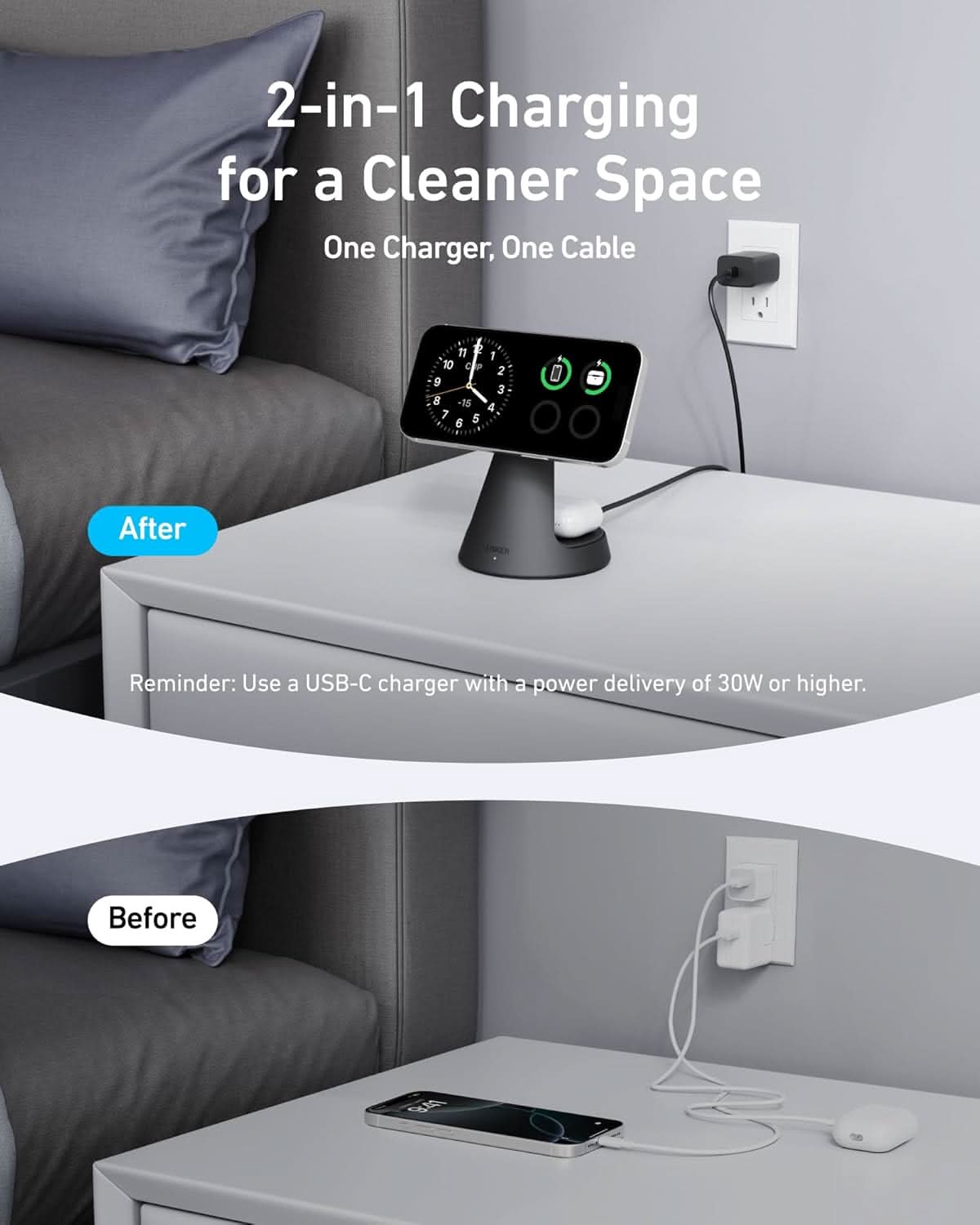 - Dual Functionality Charger: Simplify your space with a versatile 2-in-1 charging solution, perfectly designed to power both your iPhone and AirPods, keeping your desktop clean and organized.