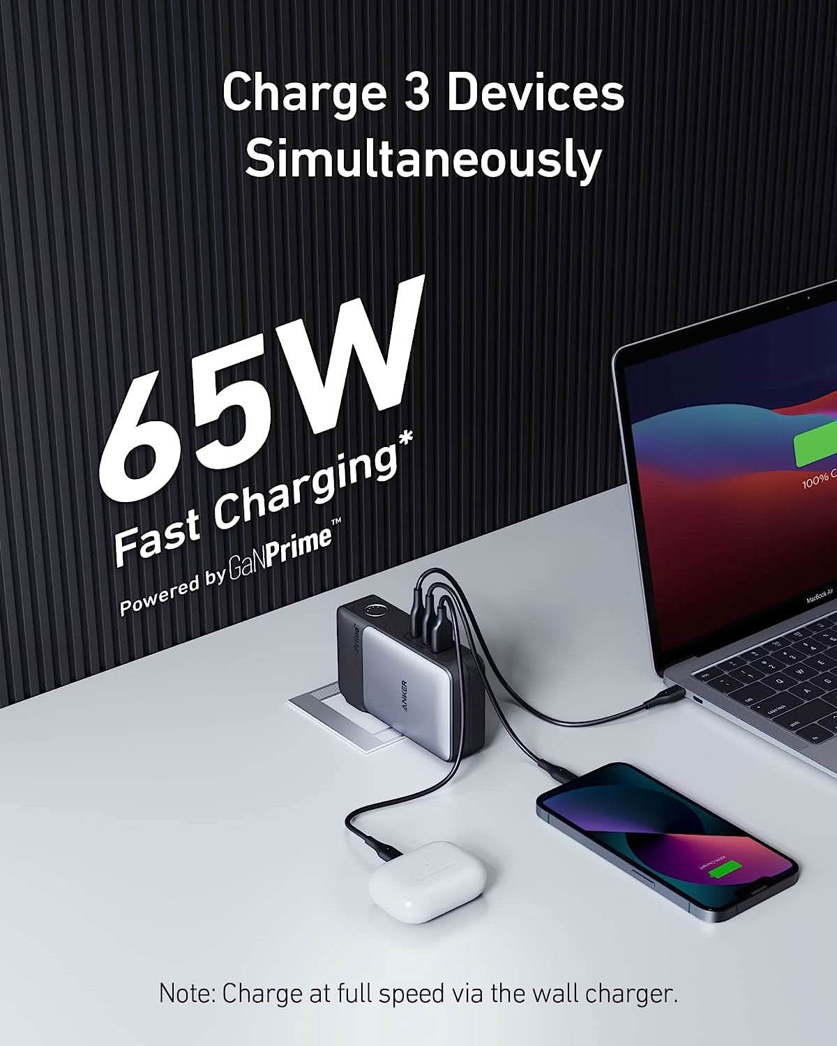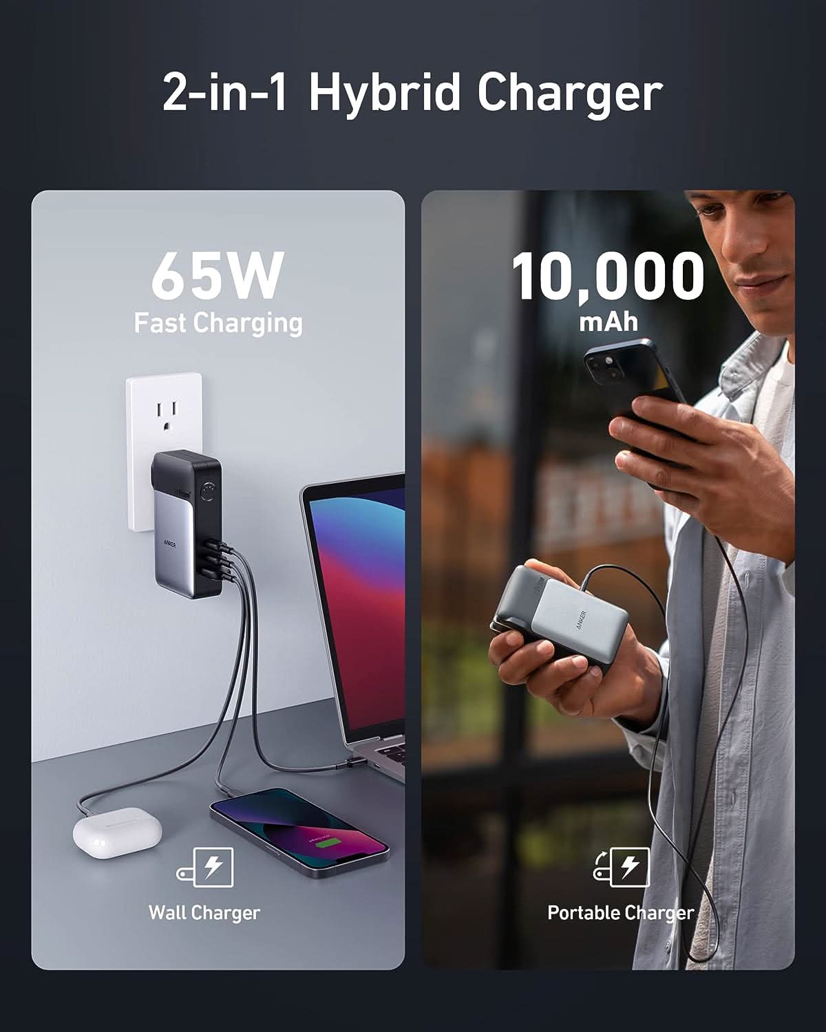 - 2-in-1 Charger: Enjoy the best of both worlds with a hybrid 65W wall charger and 10,000mAh portable charger in one.