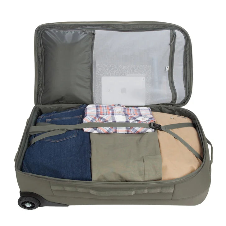 The Eddie Bauer Excursion 30 Rolling Duffel is designed for travelers who need durability, organization, and easy mobility. Made from 100% polyester with a Durable Water Resistant (DWR) finish, it protects your belongings from the elements. The spacious interior features a large divided packing area and multiple pockets for organized storage. Its lightweight telescopic handle and rugged, smooth-rolling wheels provide effortless maneuverability, while top, side, and front grab handles allow for flexible carrying. With quick-access exterior pockets, large shoe compartment and small accessories/tracker pocket, this duffel keeps essential items within reach. Perfect for extended trips, this durable duffel is built for adventure.