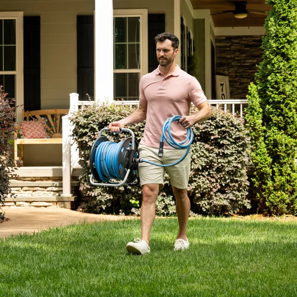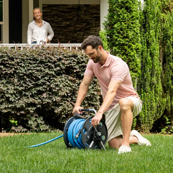 - Portable or wall-mountable metal hose reel with smooth winding action