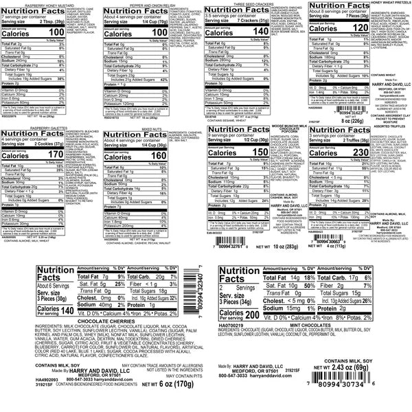 Snack lovers will enjoy gourmet delights like mixed nuts, honey wheat pretzels, and three-seed crackers, plus two delectable dips. There’s also sweet treats like Moose Munch Premium Popcorn, chocolate mini mints, truffles, chocolate-covered cherries, and raspberry galettes.