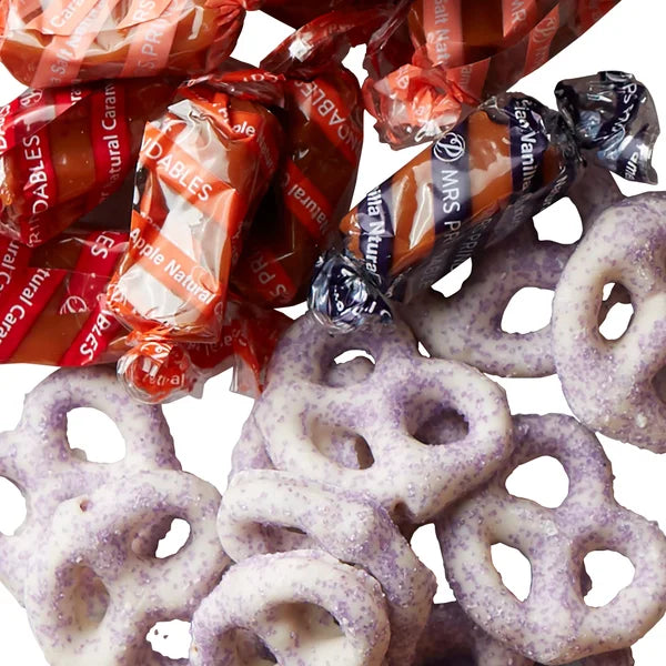 - Assorted Caramels & White Chocolate Pretzel Twists