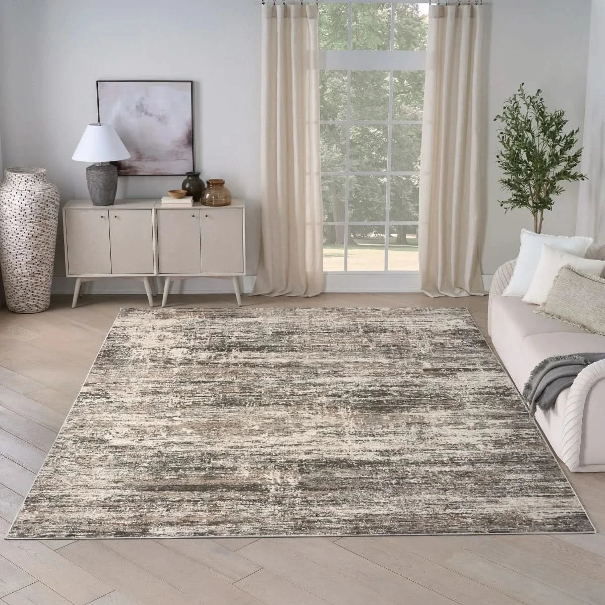 Bring cozy texture and a modern edge to your home with this abstract rug from the Arctic Collection. The distressed design blends charcoal, ivory, and taupe tones into a beautifully weathered look that adds warmth and dimension. Made from ultra-soft polyester yarns with a lustrous finish that gives the surface a subtle, eye-catching sheen.