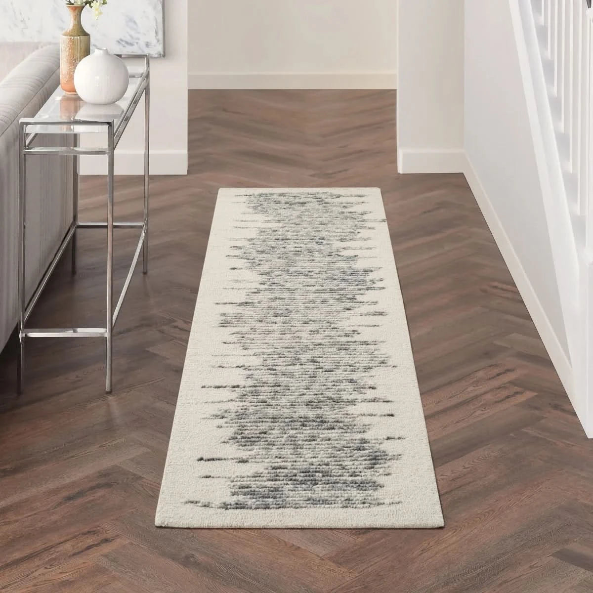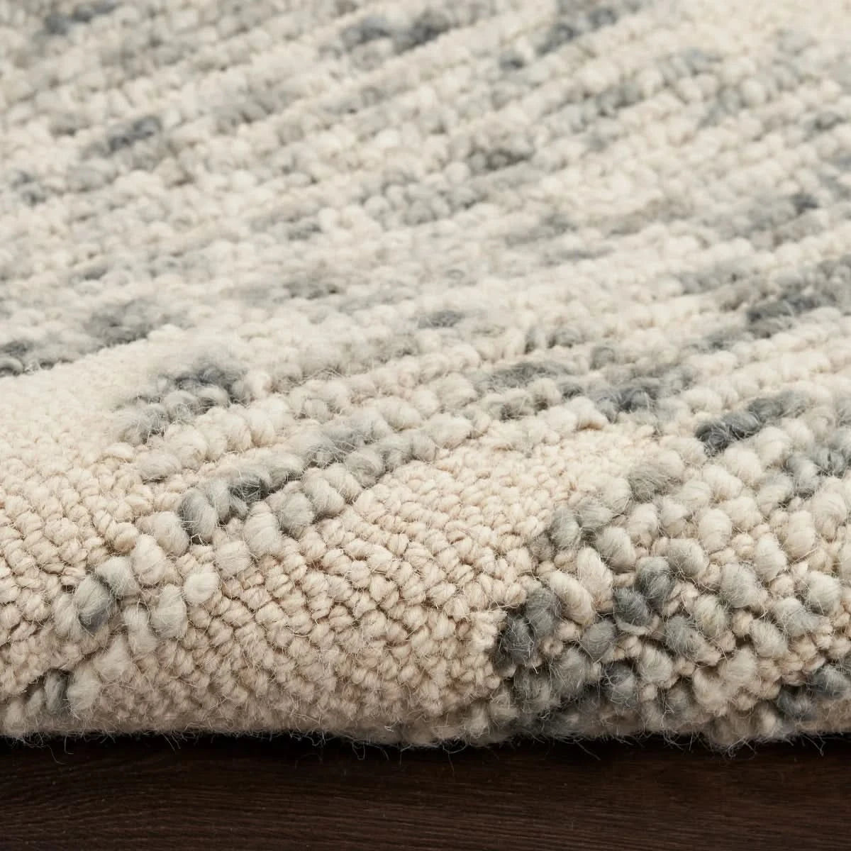 gray and soft ivory tones, brings a relaxed vibe. This modern rug is made from 100% wool with a looped pile