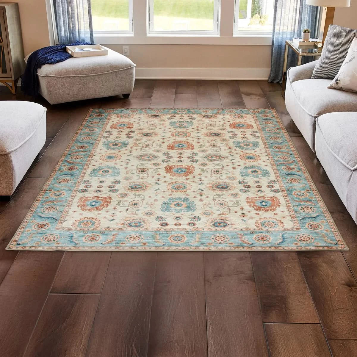 This washable area rug is the perfect addition to elevate your living room, dining room, or family room. This generously sized rug not only provides ample coverage for any of these spaces, but also offers the convenience of easy maintenance. Designed to withstand the demands of daily life, it's made with washable materials, allowing you to keep it looking fresh and clean with minimal effort.
